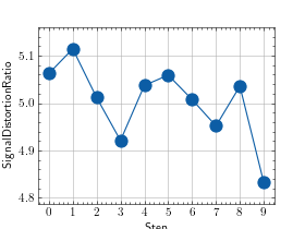 >>> # Example plotting multiple values >>> import torch >>> from torchmetrics.audio import SignalDistortionRatio >>> metric = SignalDistortionRatio() >>> values = [ ] >>> for _ in range(10): ... values.append(metric(torch.rand(8000), torch.rand(8000))) >>> fig_, ax_ = metric.plot(values)
