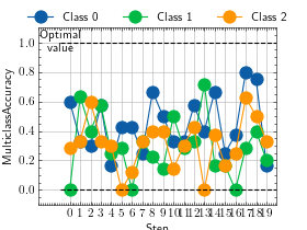 >>> from torch import rand, randint >>> # Example plotting multiple values >>> from torchmetrics.classification import MultilabelAccuracy >>> metric = MultilabelAccuracy(num_labels=3) >>> values = [ ] >>> for _ in range(10): ... values.append(metric(randint(2, (20, 3)), randint(2, (20, 3)))) >>> fig_, ax_ = metric.plot(values)