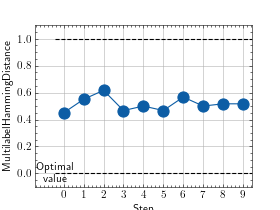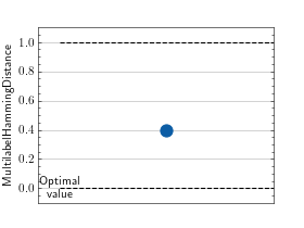 \[\text{Hamming distance} = \frac{1}{N \cdot L} \sum_i^N \sum_l^L 1(y_{il} \neq \hat{y}_{il})\]Where \(y\) is a tensor of target values, \(\hat{y}\) is a tensor of predictions, and \(\bullet_{il}\) refers to the \(l\)-th label of the \(i\)-th sample of that tensor.