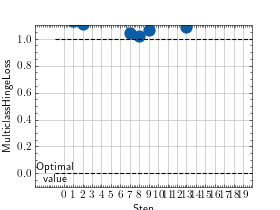 \[\text{Hinge loss} = \max\left(0, 1 - \hat{y}_y + \max_{i \ne y} (\hat{y}_i)\right)\]Where \(y \in {0, ..., \mathrm{C}}\) is the target class (where \(\mathrm{C}\) is the number of classes), and \(\hat{y} \in \mathbb{R}^\mathrm{C}\) is the predicted output per class. Alternatively, the metric can also be computed in one-vs-all approach, where each class is valued against all other classes in a binary fashion.