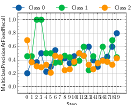 >>> from torch import rand, randint >>> # Example plotting a multiple values per class >>> from torchmetrics.classification import MulticlassPrecisionAtFixedRecall >>> metric = MulticlassPrecisionAtFixedRecall(num_classes=3, min_recall=0.5) >>> values = [] >>> for _ in range(20): ... # we index by 0 such that only the maximum recall value is plotted ... values.append(metric(rand(20, 3).softmax(dim=-1), randint(3, (20,)))[0]) >>> fig_, ax_ = metric.plot(values)