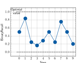 >>> from torch import rand, randint >>> # Example plotting multiple values >>> from torchmetrics.classification import BinaryRecall >>> metric = BinaryRecall() >>> values = [ ] >>> for _ in range(10): ... values.append(metric(rand(10), randint(2,(10,)))) >>> fig_, ax_ = metric.plot(values)
