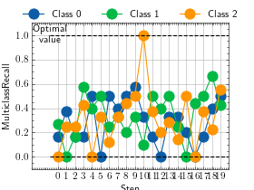 >>> from torch import rand, randint >>> # Example plotting multiple values >>> from torchmetrics.classification import MultilabelRecall >>> metric = MultilabelRecall(num_labels=3) >>> values = [ ] >>> for _ in range(10): ... values.append(metric(randint(2, (20, 3)), randint(2, (20, 3)))) >>> fig_, ax_ = metric.plot(values)