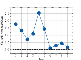 >>> # Example plotting multiple values >>> import torch >>> from torchmetrics.clustering import CalinskiHarabaszScore >>> metric = CalinskiHarabaszScore() >>> values = [ ] >>> for _ in range(10): ... values.append(metric(torch.randn(10, 3), torch.randint(0, 2, (10,)))) >>> fig_, ax_ = metric.plot(values)