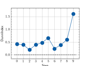 \[DI_m = \frac{\min_{1\leq i<j\leq m} \delta(C_i,C_j)}{\max_{1\leq k\leq m} \Delta_k}\]Where \(C_i\) is a cluster of tensors, \(C_j\) is a cluster of tensors, and \(\delta(C_i,C_j)\) is the intercluster distance metric for \(m\) clusters.